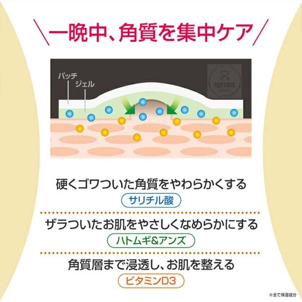 由固化角鯊烷油和美容成分製成的凝膠貼片這款凝膠貼片睡前貼敷,隔天早晨取下。